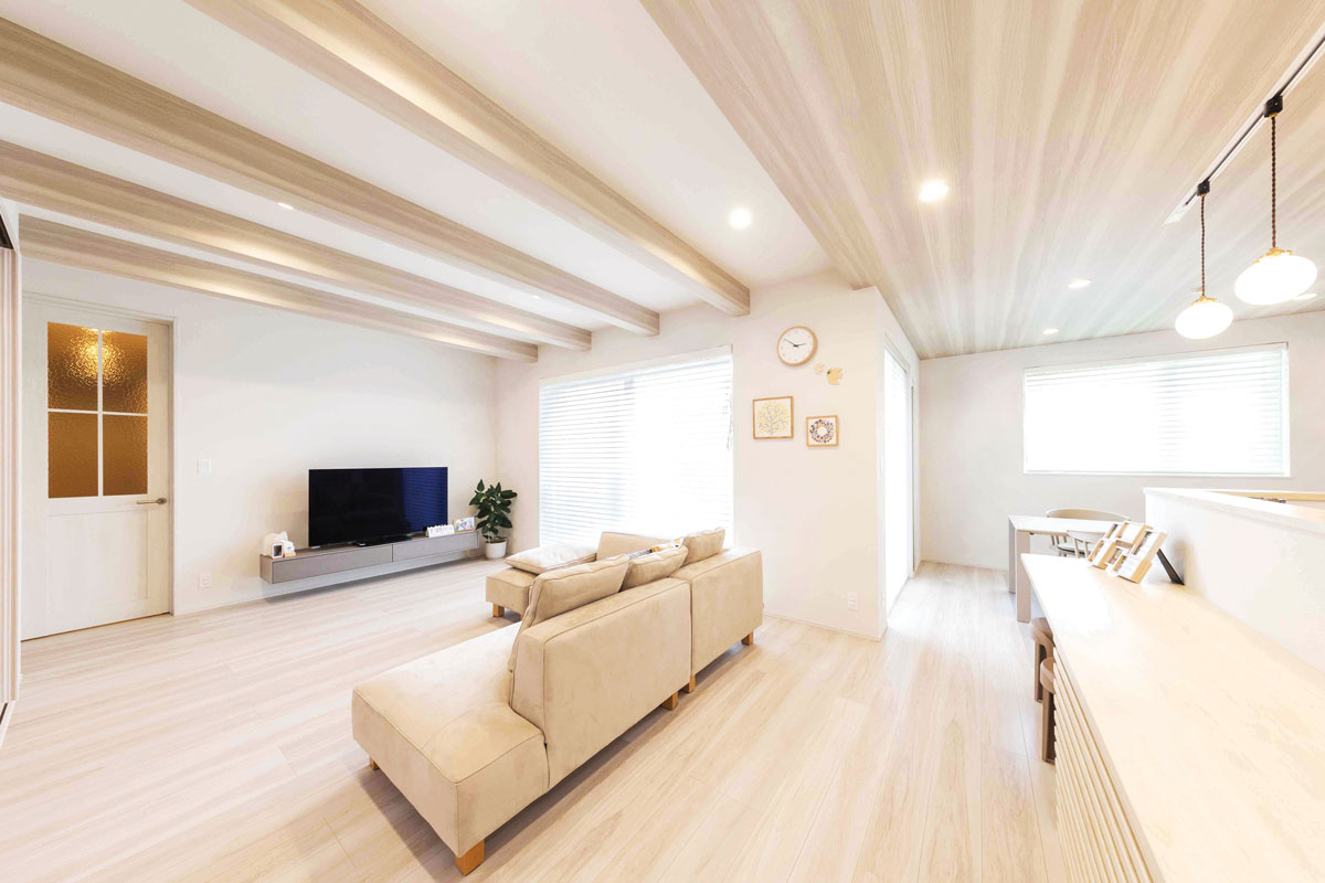 念願の戸建てを建てたH様。家づくりにおいてご夫妻が一番大切にしたのは、「家族みんなの幸せがあふれるリビング」をつくることでした。リビングを広く明るく、居心地のいい空間にして、いつでも家族が自然と集いたくなる場所にしたかったのだといいます。