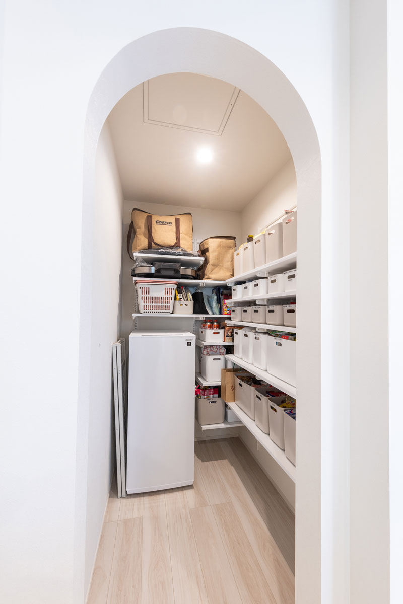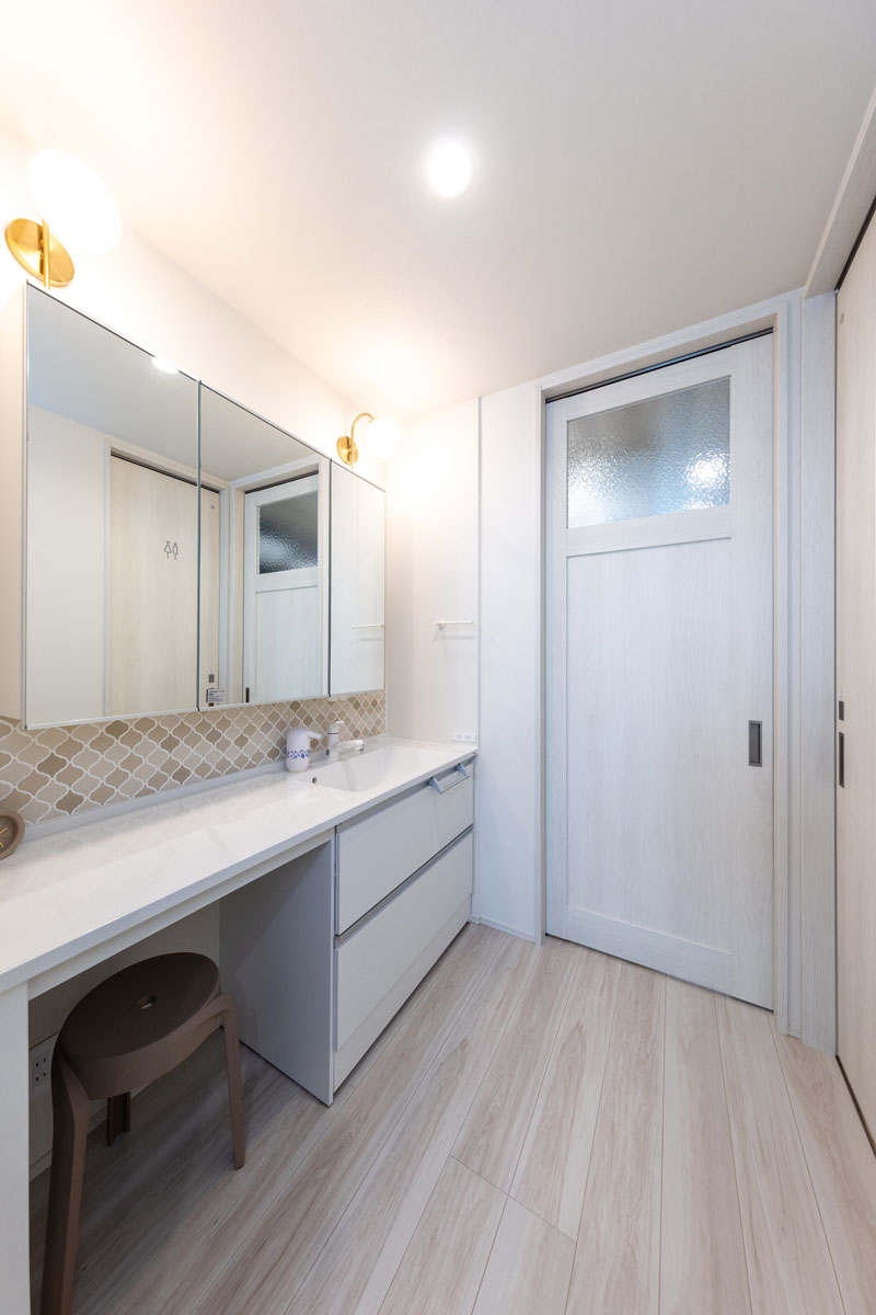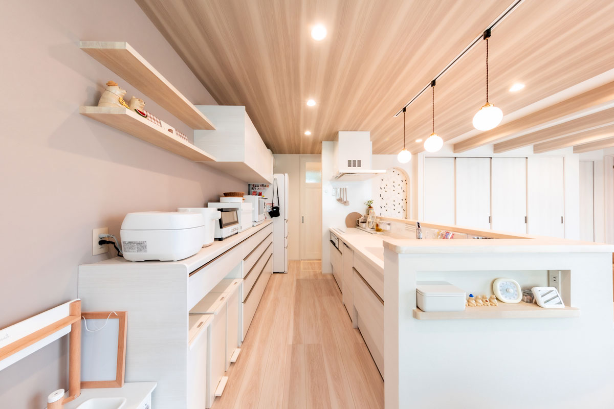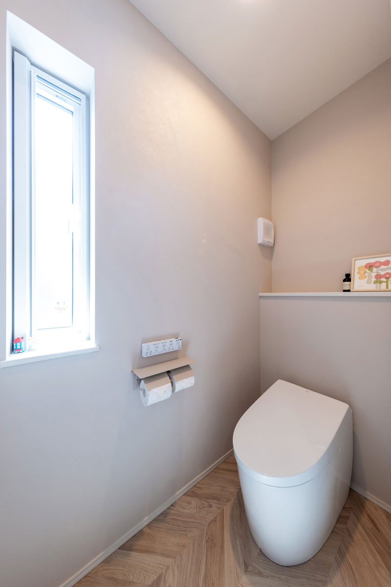 一方で内装材のチョイスは、センスのいい奥様の腕の見せ所。天井やフローリング、見せ梁、キッチン前カウンターなどの木目の箇所は、同じ木目でも少しずつトーンを変え、かと思えば壁のクロスや設備・調度は、アイボリーやベージュ、グレージュに。やさしい色彩の微妙なゆらぎがとてもハイセンス! 全体としてナチュラルな統一感が醸し出されていました。
