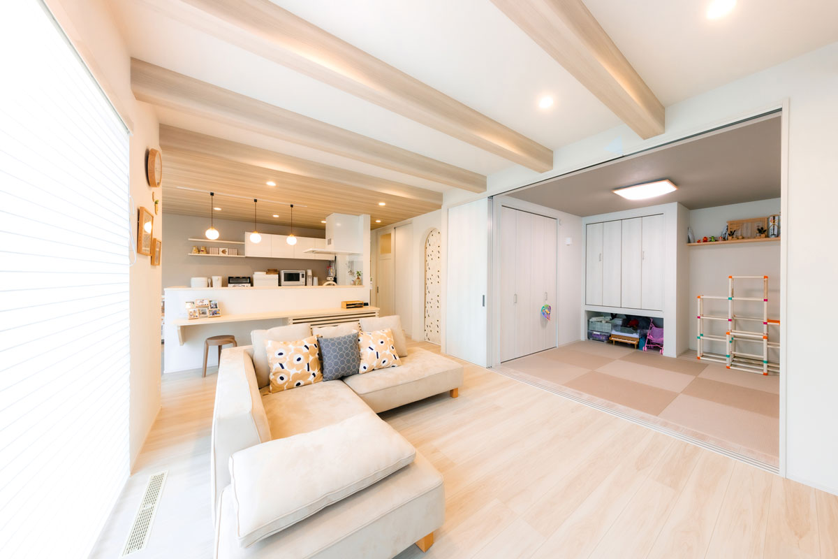 部屋が広々と感じられる天井の「梁出し」や、窓を開け放てば庭のデッキがLDKの続き間のようになる「オープンリビング」、家族みんなの個人ロッカーを備えたファミリークローゼットがすぐ隣にあるなど、ワクワクできるリビングが完成しました。