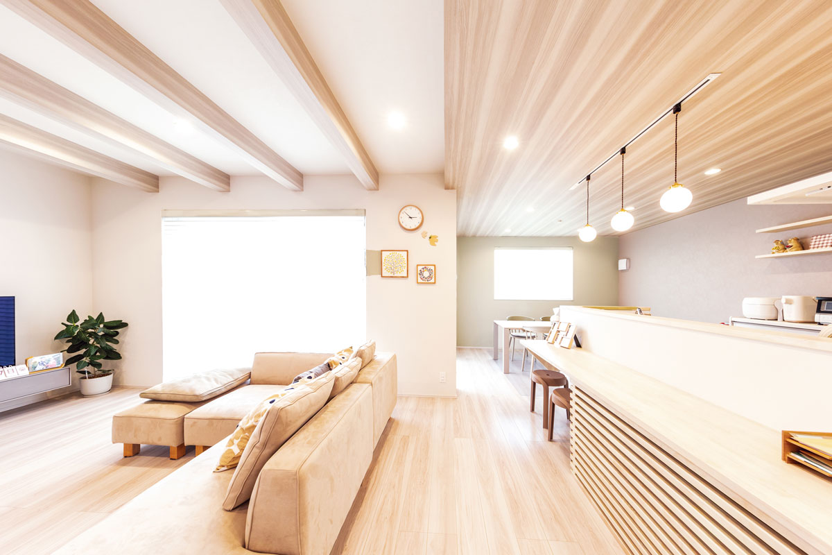 念願の戸建てを建てたH様。家づくりにおいてご夫妻が一番大切にしたのは、「家族みんなの幸せがあふれるリビング」をつくることでした。リビングを広く明るく、居心地のいい空間にして、いつでも家族が自然と集いたくなる場所にしたかったのだといいます。