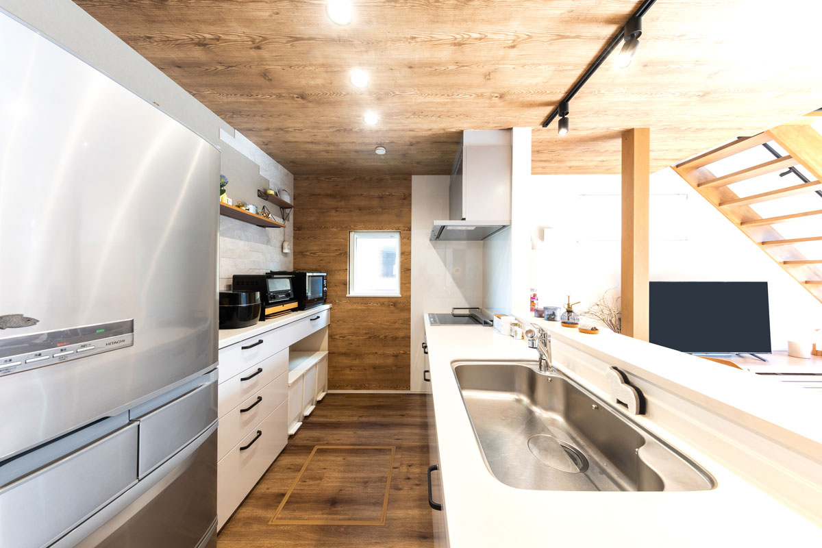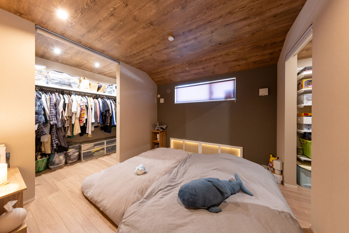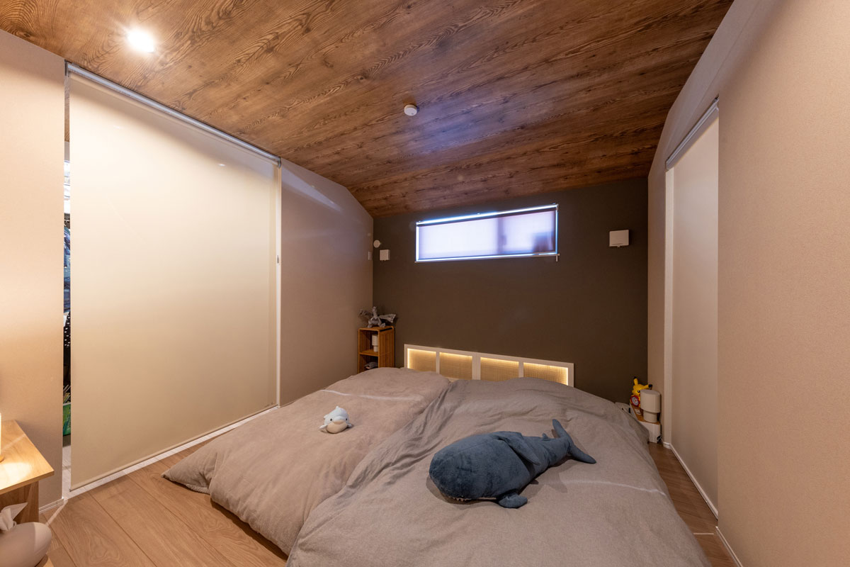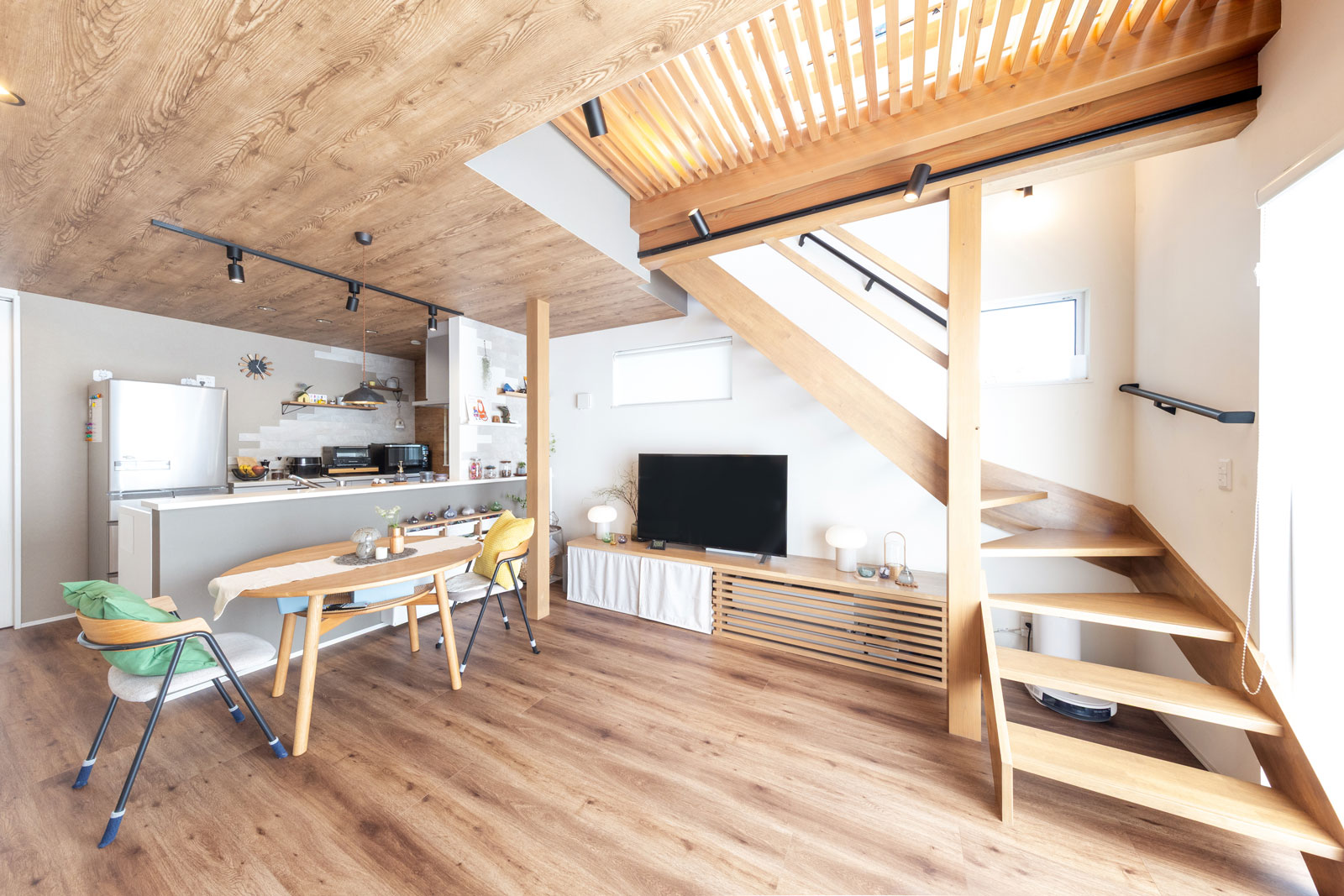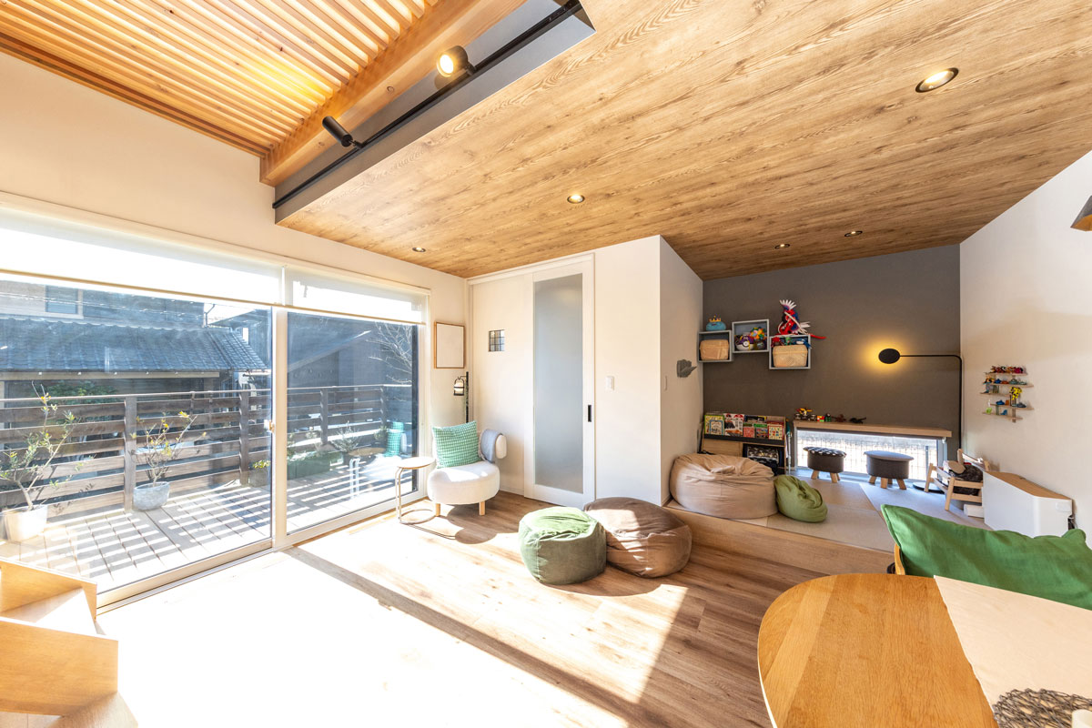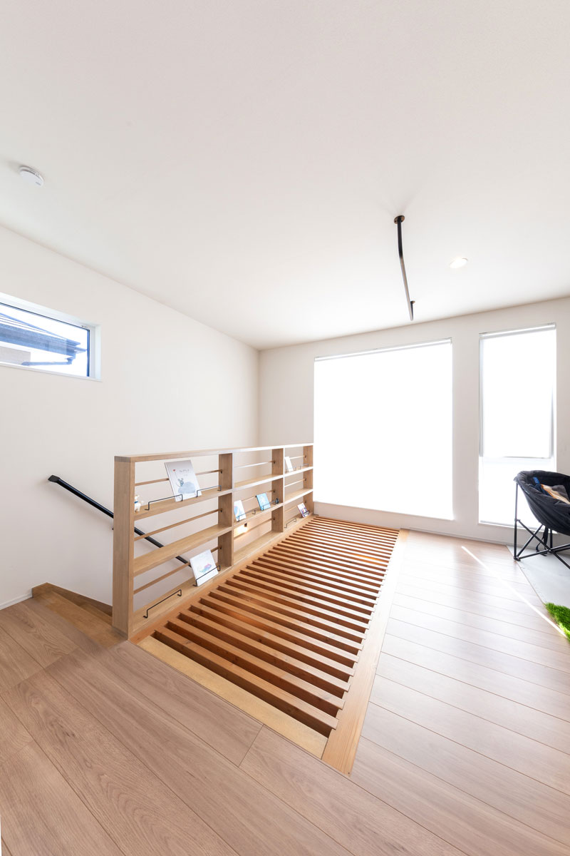 H様邸の魅力はこうした家族の居場所がたくさんあることです。ほかにも、ウッドデッキでお茶をしたり、階段の踊り場に腰掛けて庭木を眺めたり、吹き抜けの格子床に布団を敷いて空を見上げたりと、いろんな場所で自由にくつろいでいます。「そうした居場所のメインが、1階の小上がりです。スズモクの鈴木社長から『家族が顔を合わせる空間をつくっておくのはありですよ』と言われ、いいなと思いました」とご主人。主にご長男の遊び場として使われ、リビングに向かって大きく開かれており、家族が思い思いに過ごしていても、つながりを感じることができます。