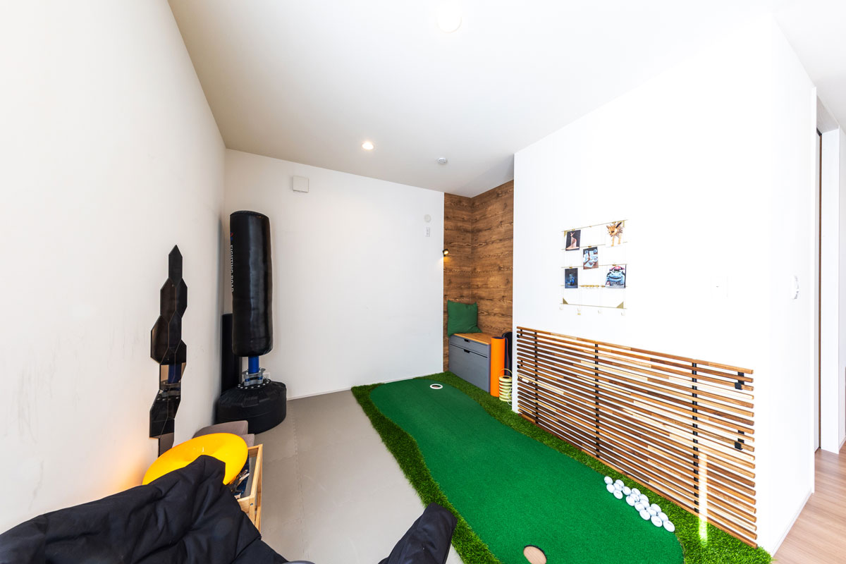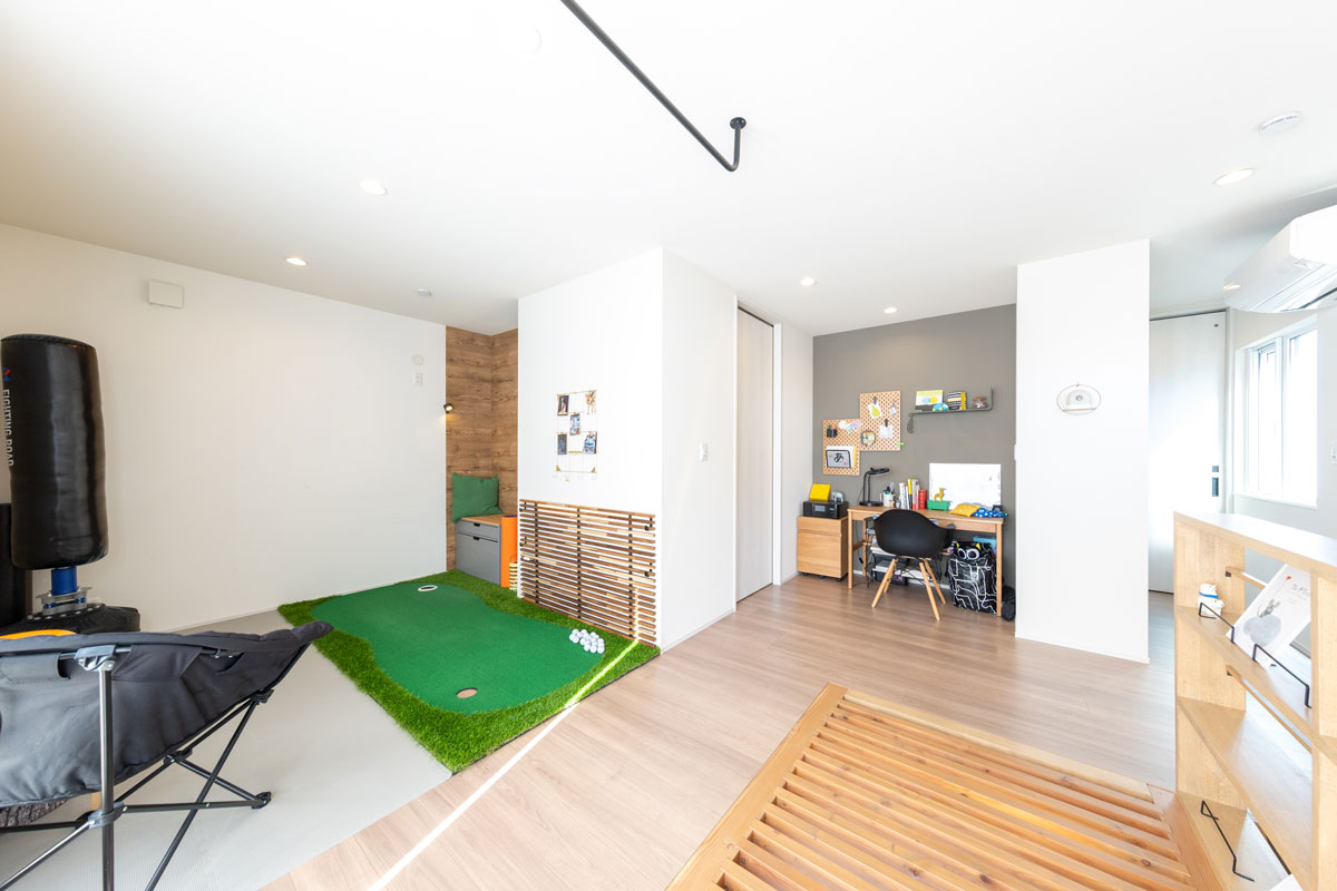 「ここは“精神と時の部屋”」。ご長男がそう名付けたのは、2階ホールのフリースペースのこと。大好きなアニメに登場する修行部屋の名にちなんでいて、一角にサンドバッグを置き、親子でトレーニングしているそうです。その横には、ご主人のゴルフのパター練習スペースも。明るく開放的な空間で、のびのびと練習できます。